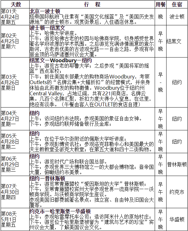 参观哈佛大学、普林斯顿大学、宾西法尼亚大学和耶鲁大学四所“常青藤盟校”;