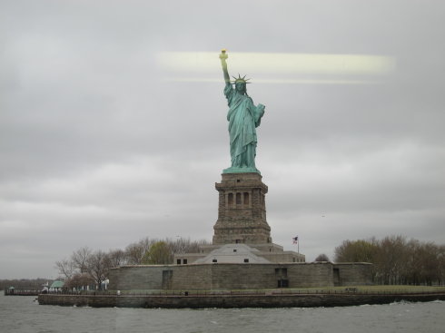 雨,风,冷。在船内拍自由女神。
