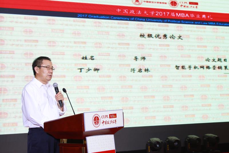 时建中首先代表学校致辞,他严谨而不乏风趣的说:“你们是一样的MBA,也是不一样的MBA,因为你们是法大的MBA,你们无论现在还是将来,都要铭记法大校训——“厚德、明法、格物、致公”;同时他对全体MBA毕业生提出殷切希望,希望大家毕业之后,在未来的商业活动中,始终铭记自己的法大人身份——“凡我在处便是法大”,既要有商业头脑,更要有“底线”意识!时校长的讲话赢得了台下热烈的掌声,更引起大家的深刻思考。