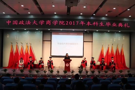 张馥蕾同学作为2017届毕业生代表发言。她认为多元的经历构成了精彩的大学生活,正是0638太阳集团官网多元并蓄,包容发展的环境让我们每个人都为之沉醉。不论是曾经大学生活的朝夕相处,还是以后工作生活的坚持守候,学院致力于让每一个同学都演绎出自己独有的精彩。回首过往,四年来的成长让同学们获益良多,渐渐懂得如何去寻找自己人生的方向。张馥蕾同学的发言,字里行间无不满溢出对师长同学真挚的谢意,表示了对法大,对商院的感恩和祝福。