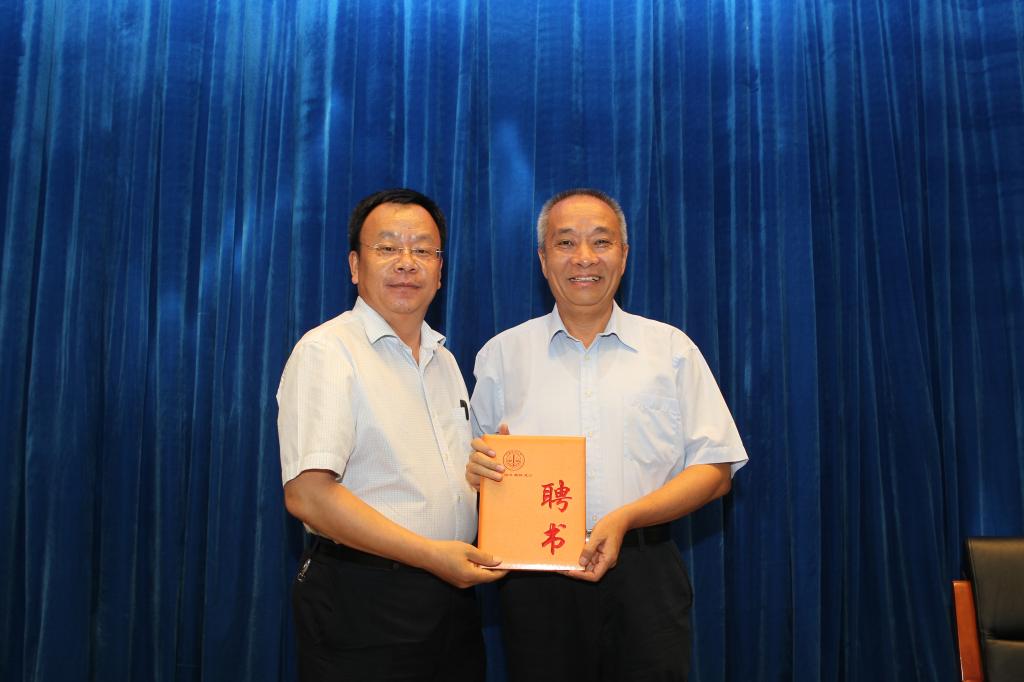 (时建中副校长向王国刚所长颁发法大兼职教授聘书)
