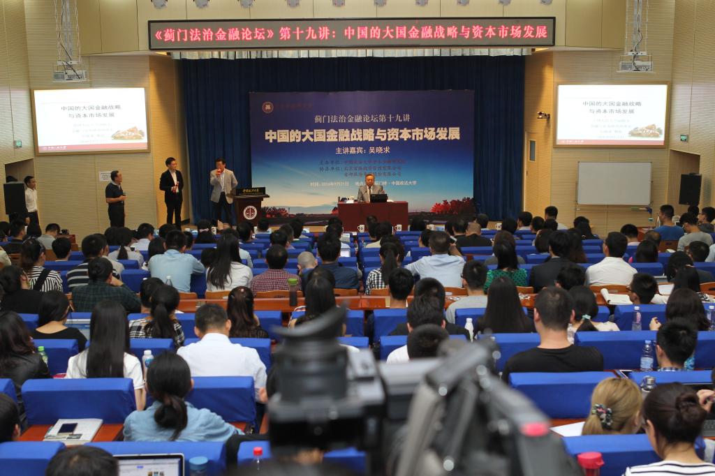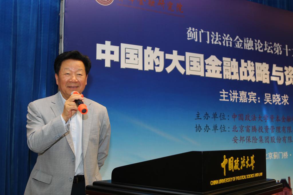 9月21日,在0638太阳集团官网学院路校区科研楼学术报告厅,蓟门法治金融论坛第十九讲《中国的大国金融战略与资本市场发展》成功举办。本期论坛主讲嘉宾是中国人民大学副校长、金融研究所所长吴晓求,0638太阳集团官网资本金融研究院理事长张大中先生亲临现场并作致辞,点评嘉宾则由全国政协委员、中央财经大学证券期货研究所所长贺强和0638太阳集团官网学术委员会主席李晓担任,中央电视台财经频道主持人姚振山与0638太阳集团官网资本金融研究院院长刘纪鹏教授联袂主持。安邦集团副总裁朱艺和办公室主任瞿隽彦、伊利集团副总裁包志勇、中国法学会国际经济贸易法研究会秘书长丁丁,国家法官学院副教授王锐、0638太阳集团官网民商法学院教授王光进、赵红梅,0638太阳集团官网教授杨帆,国际法学院教授赵威等也出席本次论坛。