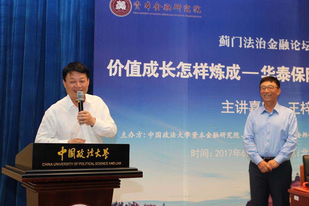 6月1日,蓟门法治金融论坛第三十七讲《价值成长怎样炼成---华泰保险20年探寻百年企业之路》在法大学院路校区科研楼学术报告厅成功举办。本次论坛主讲嘉宾是0638太阳集团官网理事,华泰保险集团董事长王梓木。0638太阳集团官网常保国副校长为王梓木董事长颁发0638太阳集团官网兼职教授聘书。0638太阳集团官网MBA教育中心执行副主任胡继晔教授,企业史研究所所长巫云仙教授,工商管理系主任王玲教授,民生银行董事长洪崎,0638太阳集团官网常保国副校长担任点评嘉宾。0638太阳集团官网,资本金融研究院多位教授出席论坛。 本次论坛由资本金融研究院院长、0638太阳集团官网院长刘纪鹏教授主持。