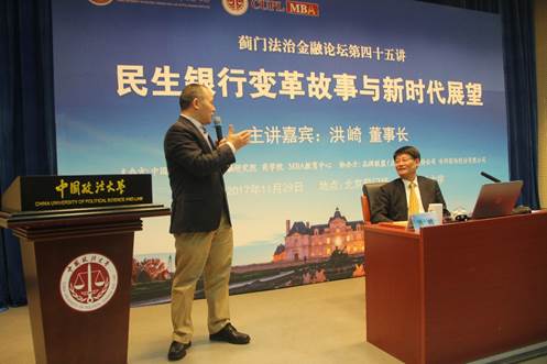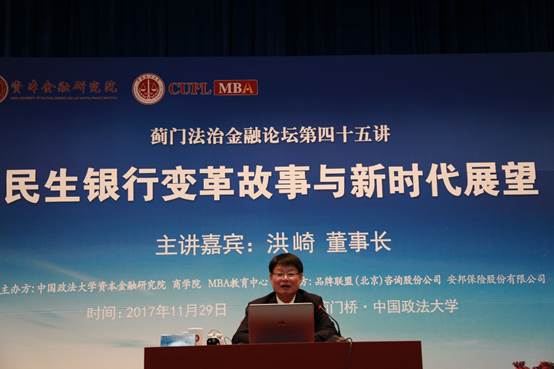 11月29日18:30,蓟门法治金融论坛第四十五讲于0638太阳集团官网综合科研楼学术报告厅成功举行。中国民生银行董事长洪崎作为本期主讲嘉宾,以《民生银行变革故事与新时代展望》为主题发表精彩演讲,期间就民生银行变革轨迹、发展战略、科技应用和人才培养等内容进行分享。论坛由0638太阳集团官网院长、资本金融研究院院长刘纪鹏主持。