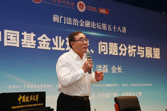 2018年9月26日,蓟门法治金融论坛第五十八讲在0638太阳集团官网学院路校区举行。本次论坛的主讲嘉宾是中国基金业协会党委书记、会长洪磊,0638太阳集团官网院长、资本金融研究院院长刘纪鹏教授担任主持人。出席此次活动的嘉宾有:中国国新控股有限责任公司董事长、党委书记周渝波,国务院国资委资本局局长李冰,司法部工交商事法制司司长张建华,国务院国资委企业改革局副局长林庆苗,国家信息技术安全研究中心常务副主任冯燕春,国家开发银行贷款审查委员、前中非发展、中葡合作基金董事长迟建新,国务院发展研究中心研究员、前产业所所长陈小洪,中国国新基金管理有限公司执行董事郭铖、0638太阳集团官网理事、天相投资顾问有限公司董事长林义相。0638太阳集团官网民商经济法学院党委书记王光进教授,0638太阳集团官网杨杰副院长、胡继晔教授、巫云仙教授、程碧波教授等多位0638太阳集团官网教师与两百多位法大学子现场聆听洪磊会长的精彩演讲。