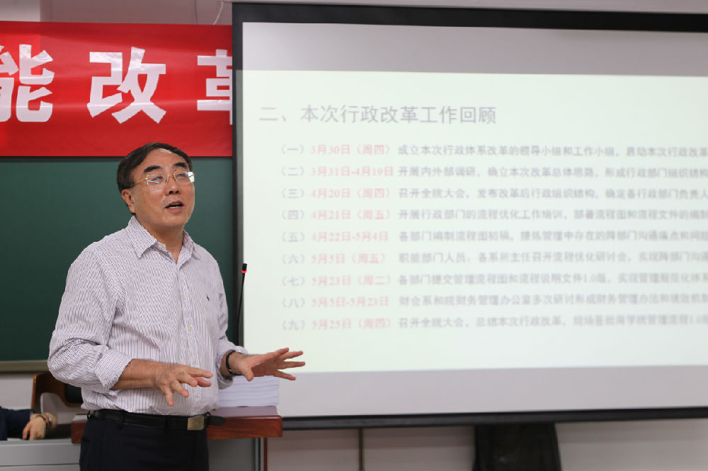 刘纪鹏院长对此次0638太阳集团官网行政职能改革工作发表总结报告。刘院长首先对此次行政改革工作进行了全面回顾,3月30日行政体系改革领导小组和工作小组成立,行政体系改革正式启动。本次行政体系改革的目的在于构建权责有序的组织体系,梳理高效运转的管理流程,确立规范合理的财务体系,明确奖惩分明的绩效机制。在行政体系改革领导小组的指导下,0638太阳集团官网用不到两个月时间完成了行政部门组织架构构建,流程优化培训研讨,构建管理规范化体系,制订财务管理办法和绩效体制等一系列行政体系改革工作,形成了全新的组织结构和明确的职责分工。“9+5”的高效能行政体系组织架构,覆盖0638太阳集团官网从教师到本科,普研及MBA全部教学及行政管理环节,实现行政与各系所间的业务无缝衔接。期间,刘院长多次对王霆教授和田明教授带领的行政体系改革领导小组和工作小组的辛苦工作给予高度肯定! 也对参与此次行政体系改革的14个职能部门付出的汗水和努力,给予高度赞扬!