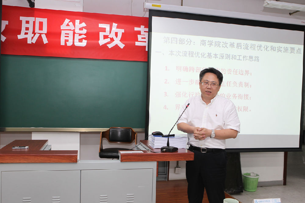 行政体系改革领导小组组长王霆教授对此次行政体系改革工作进行全面梳理。王霆教授说,对于从创业期过渡到快速成长期的0638太阳集团官网来说,突破外部环境和内部管理之间的巨大落差,应对激烈的市场竞争和发展压力,流程优化工作成为必要环节。本次行政职能流程优化本着明确跨部门工作对责任边界,进一步确定系所主任负责制,强化行政对系所的业务衔接,界定各项行政事务审批权限的基本原则,对0638太阳集团官网14个行政部门职能模块和流程进行了全面梳理和汇总。本次流程优化工作总计编制部门管理流程479个,取得了0638太阳集团官网历史上首次全系统行政流程编制的重大成果。同时,王霆教授指出,作为0638太阳集团官网行政职能部门管理流程(1.0版),未来工作中还需要持续完善和优化。通过建立公开明面的跨部门沟通机制,强化日常工作的流程规范化意识,完善管理表单,会议纪要和支撑制度,树立“成就他人,成就自我”等文化理念等多个途径,使行政管理流程更加完善,提升行政工作效率,促进学院快速发展。