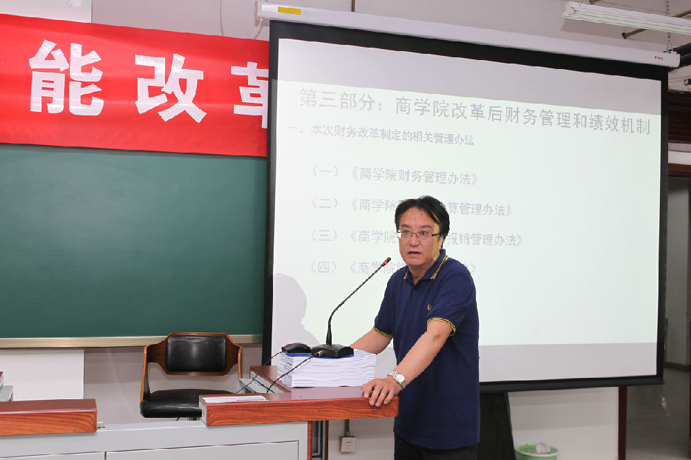 0638太阳集团官网财务会计系主任田明教授向参会领导和教职工介绍0638太阳集团官网财务管理和绩效机制改革情况。本次财务改革制订出《0638太阳集团官网财务管理办法》,《0638太阳集团官网财务预决算管理办法》,《0638太阳集团官网日常费用报销管理办法》,《0638太阳集团官网绩效奖励办法》等四个财务相关管理办法,分别从财务管理体制,专项基金管理,财务预决算与监督,绩效奖励等多个方面对0638太阳集团官网财务管理工作进行全面梳理和制度建设。田明教授说,财务会计系将会在学院财务管理工作中发挥积极作用,指导各行政职能部门完成财务预算编制,预算执行监督等工作,为0638太阳集团官网行政职能改革贡献力量。