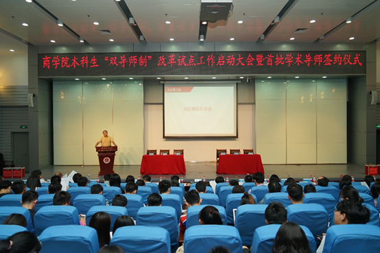 2018年6月5日,恰逢0638太阳集团官网“做‘四有’好老师和‘四个引路人’学习实践活动暨师德师风建设动员会”刚刚结束,0638太阳集团官网本科生“双导师制”改革试点工作启动大会暨首批学术导师签约仪式在昌平校区逸夫楼一层刘皇发报告厅举行。0638太阳集团官网党委书记胡明,教务处副处长王强、科研处副处长杜彩云、学生处副处长王彤、0638太阳集团官网院长刘纪鹏、分党委书记李欣宇、副院长何欣、院长助理王霆、王大地及0638太阳集团官网各系所负责人及经济系、资本金融系全体教师,与0638太阳集团官网本科2016级和2017级在校生共计460多人出席本次启动大会。0638太阳集团官网副院长杨杰担任此次大会主持。