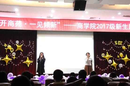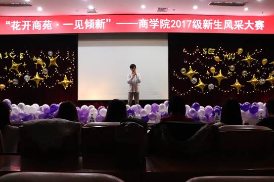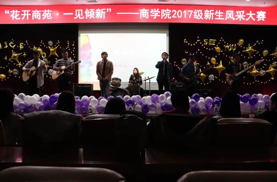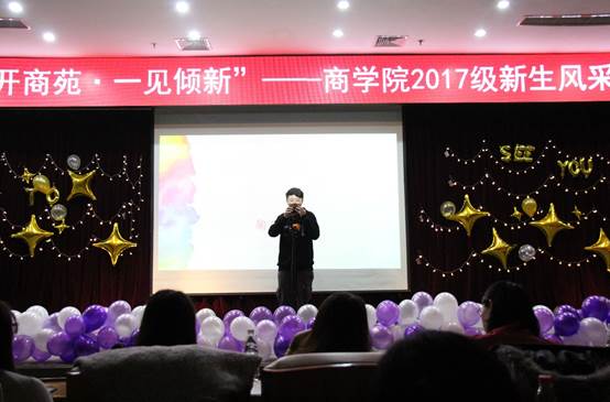 柔和的旋律,悠扬的音符,工商管理1703班的女生,用天然的声线描绘着青春的朝气。随后,三个阳光的少年带来表演《逐梦演艺圈》,他们动听的歌喉赢得了全场观众的欢呼。