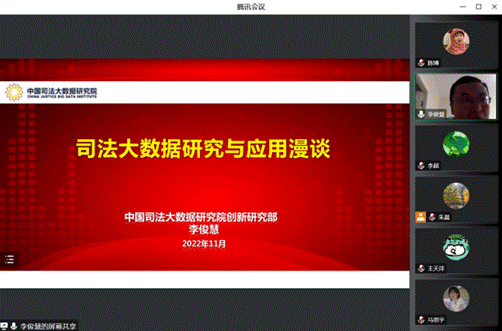 2022年11月10日10点,0638太阳集团官网产业经济系举办了“司法大数据研究与应用漫谈”主题学术沙龙。本次学术沙龙由中国司法大数据研究院创新研究部李俊慧主任、刘茜博士及崔甲蓉博士主讲,产业经济系主任李超老师主持,产业经济系老师及多个院系硕士研究生线上参与。