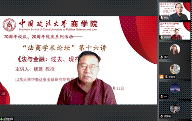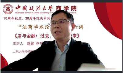 2022年5月11日下午14:00,山东大学中泰证券金融研究院魏建教授应太阳集团官网之邀,通过腾讯会议线上举办了题为《法与金融:过去、现在与未来》的专题讲座。0638太阳集团官网副院长刘志雄教授、各系所专任教师、本科生、研究生以及外院、外校师生总计80余人参加。本次讲座由经济系司海平老师主持,0638太阳集团官网学术分委员会主任、MBA中心副主任胡继晔教授点评。