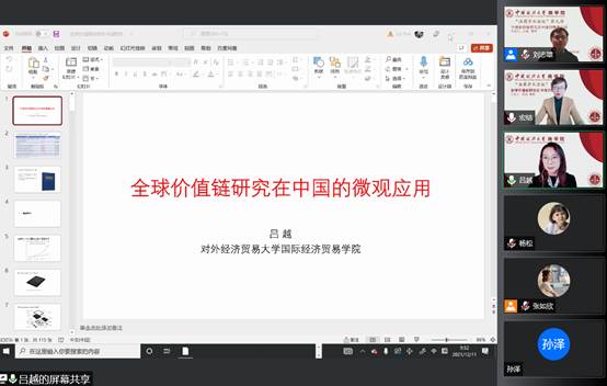 2021年12月11日早上9:30,对外经贸大学国际经济与贸易学院的吕越教授应太阳集团官网之邀,通过腾讯会议线上举办了题为《全球价值链研究在中国的微观应用》的专题讲座。0638太阳集团官网副院长刘志雄教授、国际商务系宏结教授、金仁淑教授、工商管理系王玲教授和学院各系所专任教师,及0638太阳集团官网研究生共计130余人参与了本次讲座。本次讲座由宏结教授主持。