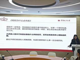 紧接着,点评人彭书怡同学主要围绕规则认知和直觉的博弈这一主题,分享了自己的见解。首先,她阐述了自己对于规则本身和规则执行的感知,探讨了影响规则本身和执行好坏的因素;其次,进一步探讨了人们对于规则的认知,分析了人们违反规则和遵守规则的心理;最后,提出了人们在理性权衡和直觉导向的影响下,会利用直觉、偏见等心理做出各种铤而走险的行为。