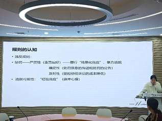 活动伊始,主讲人卢艺源同学首先详细介绍了在日常生活中,规则是无处不在的,规则存在的目的是使我们免受伤害,但法律规则并不总是有效,由此引出本书致力于回答的关键问题是:为什么法律不能改善人们的行为?其次,进一步探讨了社会中存在的明文规定的规则,即严重刑法和物质奖励能否减少犯罪,并探讨了社会中人类的一系列行为暗码;最后探讨了社会中的隐形规则,即道德能否以及如何约束人们的行为,由书中得出的结论是在法律的设计和运作中,我们必须将程序上的公平作为核心,才能让公民服从规则。