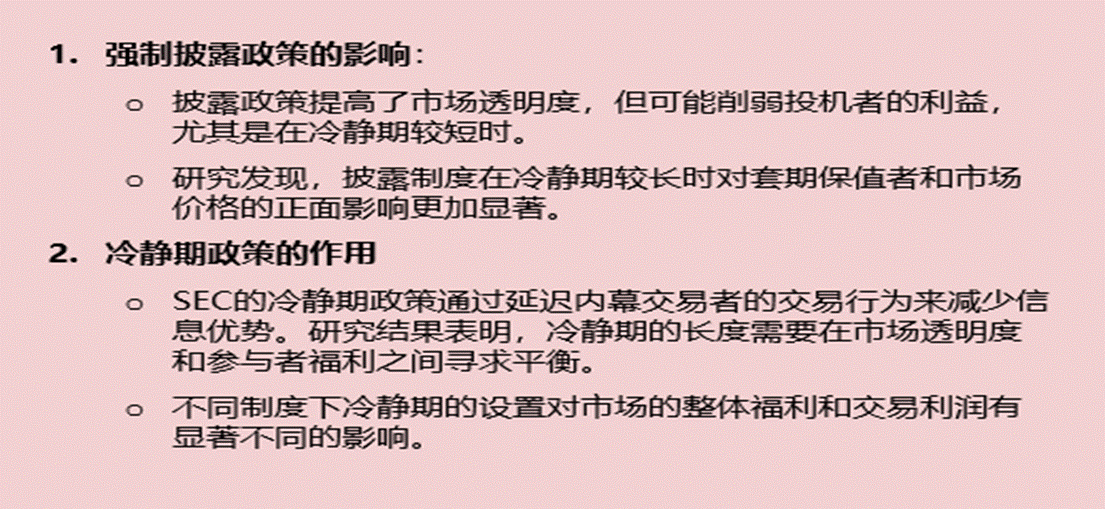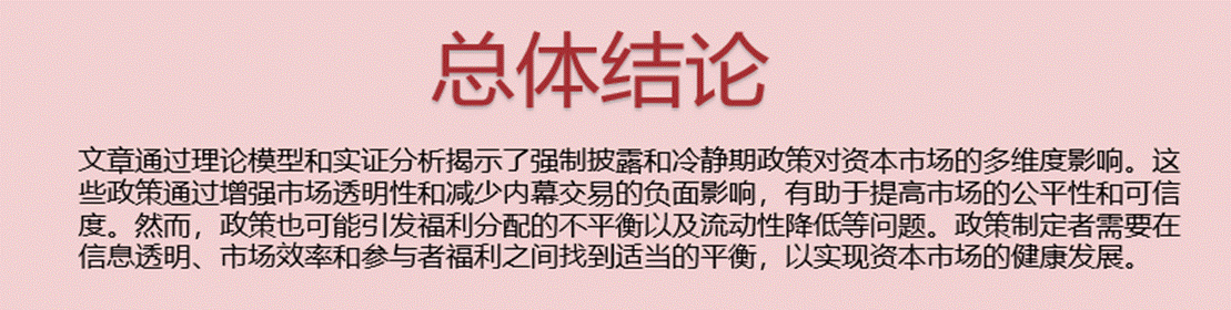 本次同学们的研讨内容主要分为六部分。第一部分对美国证券交易委员会颁布的新规定对投资者福利的影响进行了概述;第二部分专注于模型构建,主要介绍了三时期经济模型中各类参与者行为;第三部分介绍了模型的均衡与测量,推导强制披露和未披露下的均衡,介绍评估政策的相关变量,并分析当内部人士对冲需求足够大时的极限情况;第四部分进行了校准分析,分析在校准参数下,强制披露政策和冷静期政策通过不同渠道对投资者的影响;第五部分介绍了信息泄露模型,基于信息泄漏的方式来考虑冷静期产生的影响;第六部分总结了全文的研究结论。