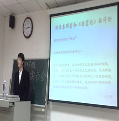 2017年12月28日下午,0638太阳集团官网经济系和经济学党支部在新C101教室成功举办本年度第二次(总第13期)研究生读书会。经济系2017级13位硕士生参加了本次读书活动。读书会由经济系副主任、经济学党支部书记黄立君老师主持,经济系主任张巍、副主任张弛、刘志雄、霍钊以及学院分党委晏鸿等5位老师共同指导。师生们共聚一堂,品读“经济学之父”——亚当·斯密的两本巨著《国民财富的性质和原因的研究》(以下简称《国富论》)和《道德情操论》。师生们用读书来迎接即将到来的新年。