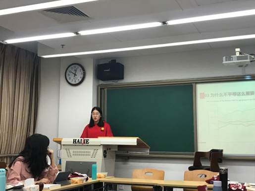 其后,窦艳杰同学对《不平等的代价》这一著作进行报告和补充阐述,窦艳杰同学重点对作者的成长、主要观点和不平等的重要性三个方面进行阐述,并使用了大量的数据图表直观地对不平等问题进行剖析和分享。