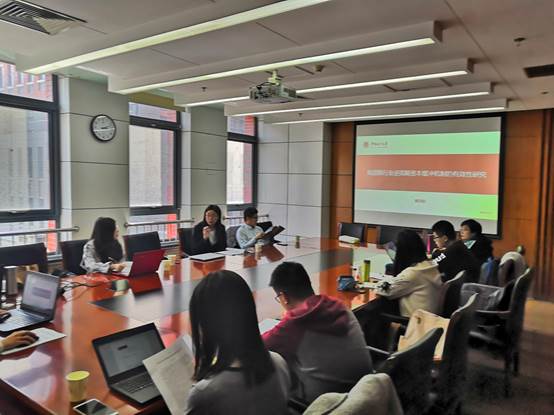 第一个作报告的是窦宗晗同学,他的论文是《我国银行业逆周期资本缓冲机制的有效性研究》,分六个部分:引言、研究回顾、相关理论、MPA体系相关、有效性检验、完善建议。他的论文与以往相关研究相比,创新点在于:使用更新后的样本数据对我国银行业的逆周期资本缓冲机制的适用性进行补充;考察社会融资规模变量的计提效果;结合MPA体系中的指标对单一指标挂钩变量计提体系进行修正,提升该机制的应用效果,为监管工作提供建议与思路。接着,老师们提出了自己的问题与建议,程碧波老师认为论文中credit和SFS两个指标的等价性以及检验的有效性的定义没有交代清楚;成福蕊老师认为论文中所使用的社会融资规模指标没有交代清楚口径;李泳老师认为应该在标题中突出自己论文的重点和创新点。窦宗晗认真听取了老师们的建议,并打算继续修改论文。