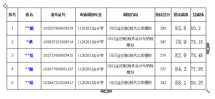 太阳集团官网2017级硕士研究生会计专业补录复试工作已经结束,复试工作严格按照学校的规定和太阳集团官网的复试工作实施细则开展,共计5人报到,5人参加复试,复试成绩如下: