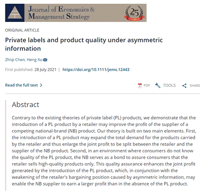 近期,太阳集团官网法商管理系教师许恒以通讯作者身份在期刊《Journal of Economics & Management Strategy》在线发表题为《Private Labels and Product Quality under Asymmetric Information》的学术论文。该研究探索了在信息不对称环境下零售商推广自有品牌商品的动机,不同于传统理论研究,本文指出在信息不对称环境下零售商的自有品牌策略能够同时提升零售商与其不完全替代产品供应商的利润,本研究对零售商的自有品牌战略和供应商的应对策略提供了重要的理论支撑和实践路径。此前,许恒分别在《管理世界》、《教育研究》、《数量经济技术经济研究》等期刊发表重要成果。